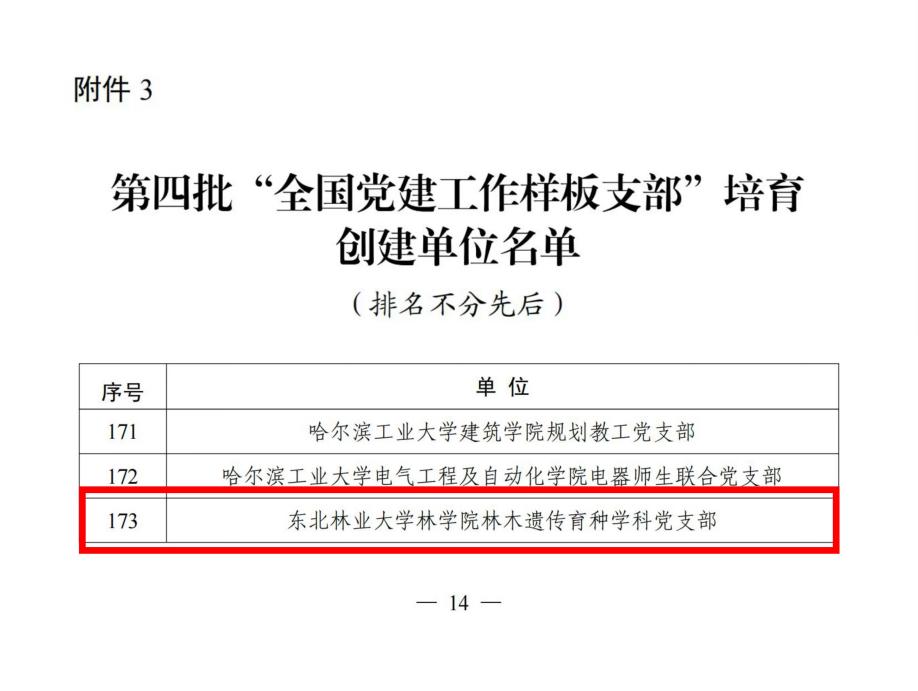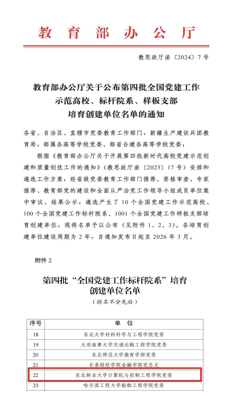 日前,教育部公布了第四批新时代高校党建示范创建和质量创优工作遴选结果,我校计算机与控制工程学院党委入选“全国党建工作标杆院系”培育创建单位,是我校首次入选。林学院林木遗传育种学科党支部入选“全国党建工作样板党支部”培育创建单位。