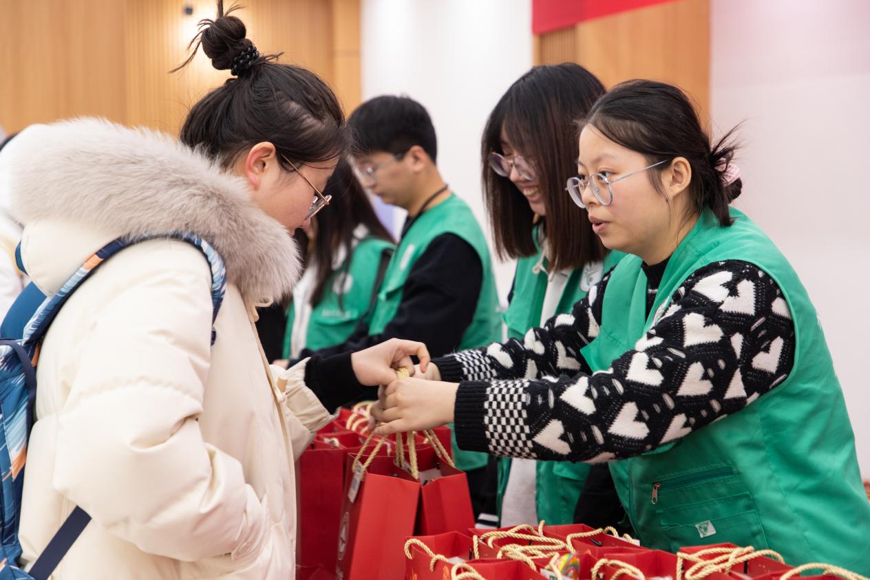 活动在一站式学生服务中心进行。活动现场,志愿者们将提前分装好的“加油包”摆放整齐,学生处相关领导老师为考研学子发放加油包的同时,亲切询问报考院校并为同学们加油打气,“给你选一双红色的袜子,成绩一定开门红!”“刮开覆盖膜可以去二楼4号窗口兑换礼品”“孩子,研考加油!上岸!”学工部部长、学生处处长王博在发放现场亲切送出祝福。