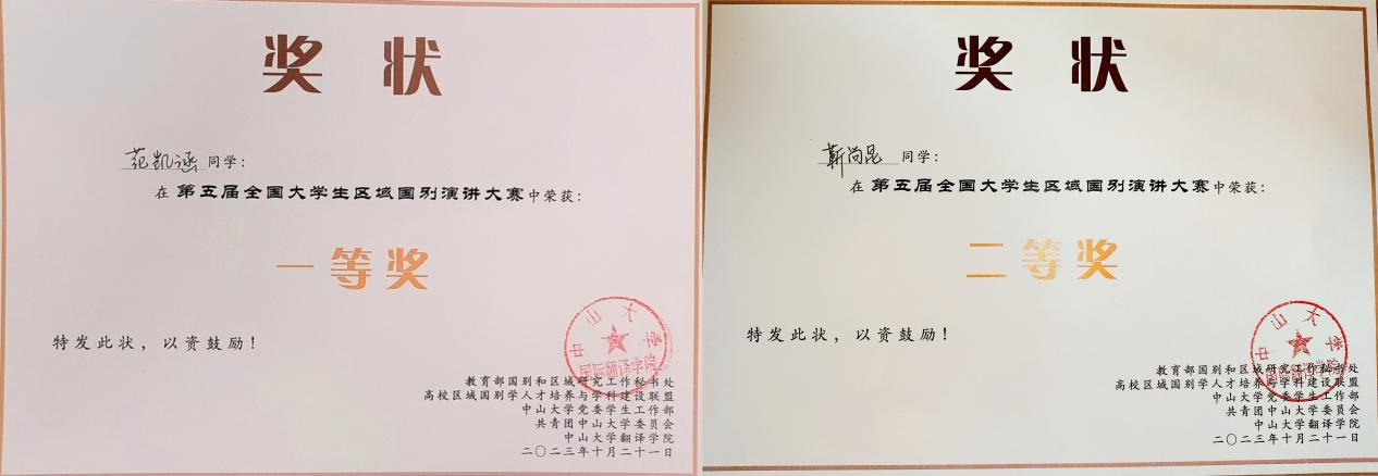 10月21日,第五届全国大学生区域国别演讲大赛在中山大学(珠海校区)落下帷幕。历经初赛、复赛、决赛的层层筛选与激烈角逐,我校文法学院政治学与行政学专业学生范凯涵、靳尚昆分别获得大赛一等奖、二等奖。指导教师程铭、王雪梅获优秀指导教师奖。