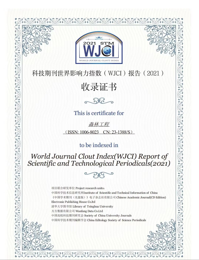 为促进期刊高质量发展,助力学校“双一流”建设,《森林工程》编辑部努力提高期刊的学术质量和影响力,取得了良好成效。近年来,《森林工程》被北大中文核心期刊和Scopus 数据库收录,先后入选中国科技核心期刊、RCCSE核心期刊(A 类期刊)、中国农林核心期刊、林草科技重点期刊、中国农业领军期刊、中国高校优秀科技期刊。自黑龙江省社会效益评估开始至今,《森林工程》每年均获得优秀等级。《森林工程》2022年影响因子(中国知网)为3.153,在全国林业类67种期刊排名第二,在全国交通运输类149种期刊排名第三。