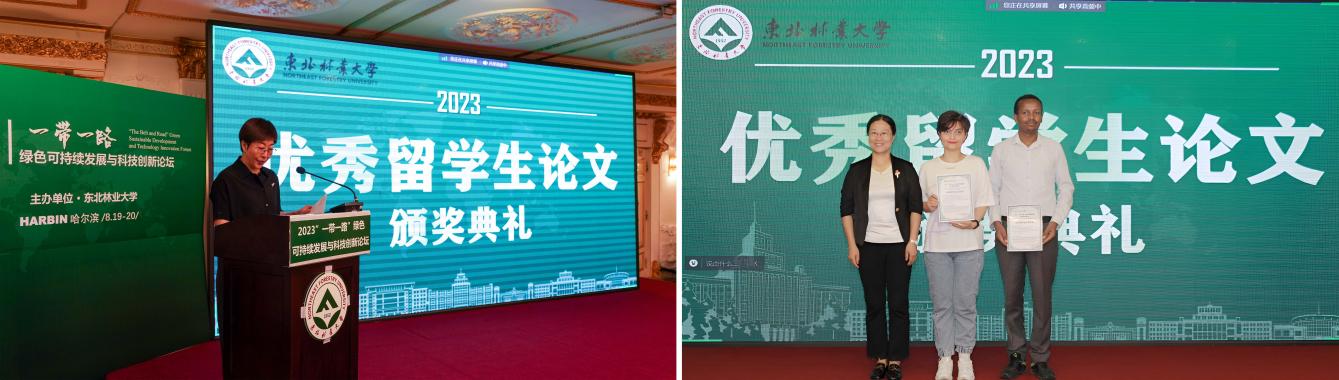 本届论坛评选出2项优秀留学生论文奖。东北林业大学国际交流学院院长骆颖了宣读获奖名单,东北林业大学党委副书记宋吉红向获奖者颁发证书。