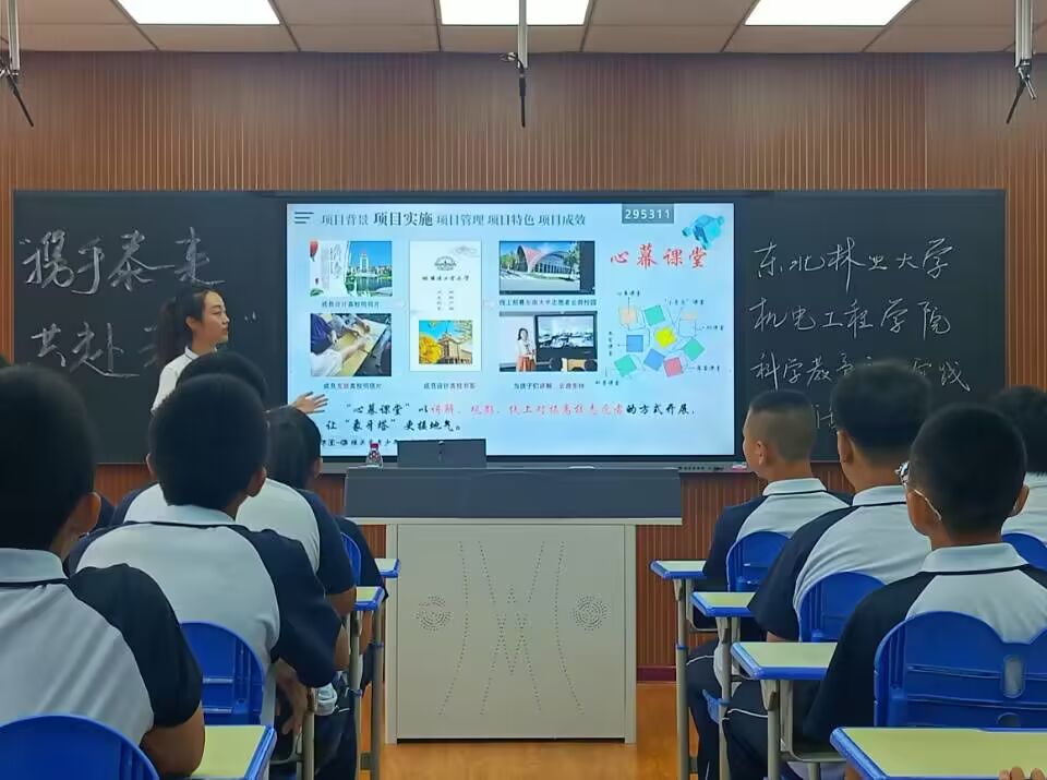 科学教育实践团队一行随后走进泰来二中,启动“快乐魔方”科学实践班。王佳彤代表学院向泰来二中赠送了由3D技术打印而成的东北林业大学主楼模型;团队成员、机械设计教研室副教授吴哲,围绕“融合、突破、努力”3个主题,勉励孩子们强基础、勇创新、建新功,为国争光;团队成员、学院2023级本科生辅导员满東妮声情并茂地介绍了“魔方课堂”以及“AI课堂”的内涵;团队成员、学院大学生创新创业中心的同学们,通过视频讲解、现场演示等方式,还原了“机甲大师赛”扣人心弦的赛况,科普了S₁机甲的结构原理、操作方法等,迅速引爆课堂气氛,点燃孩子们的热情。