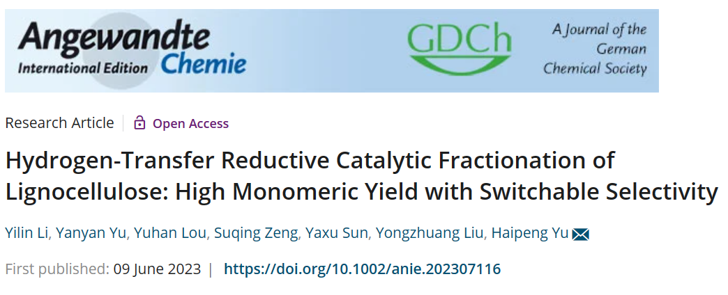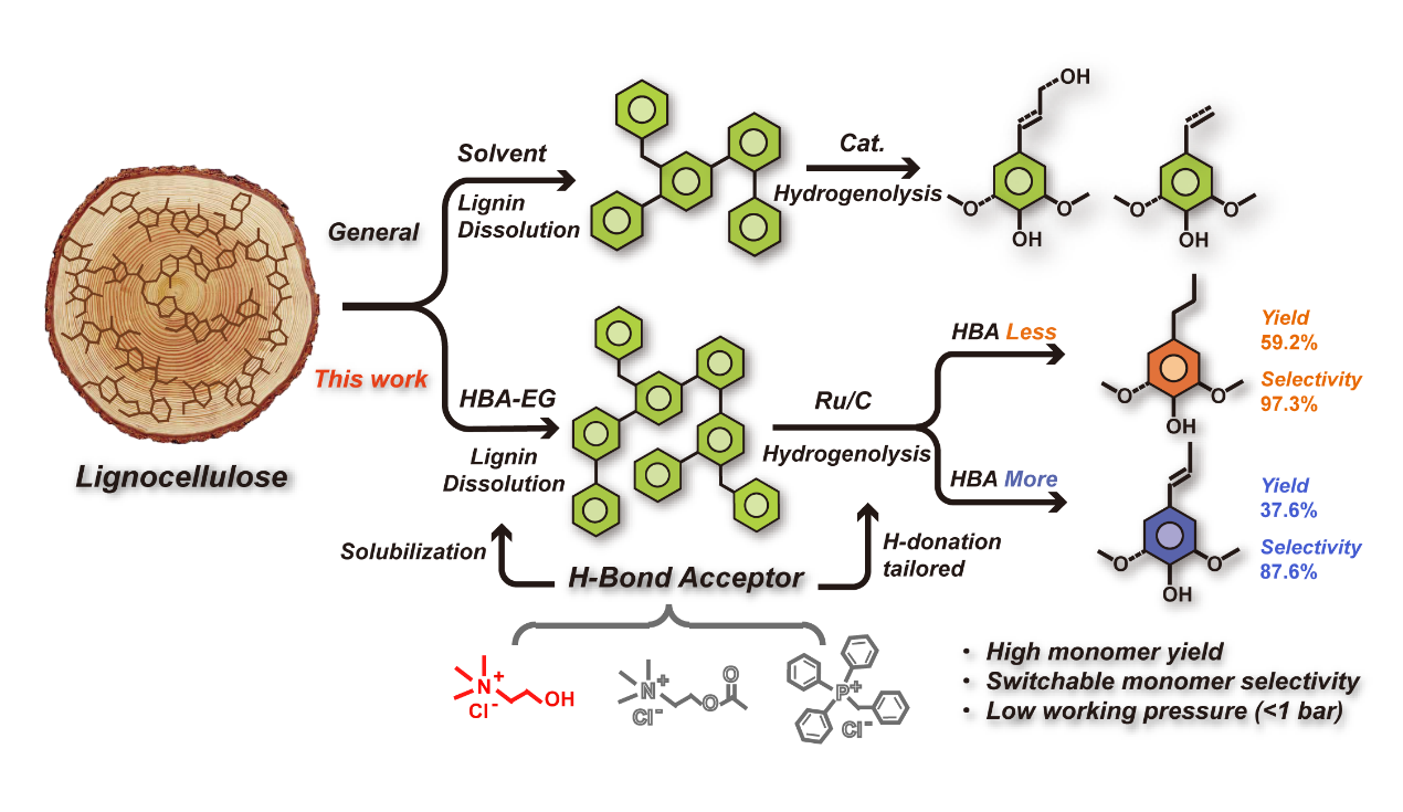 近日,我校生物质材料科学与技术教育部重点实验室于海鹏教授团队在国际著名期刊AngewandteChemieInternational Edition上发表了题为《Hydrogen-Transfer Reductive Catalytic Fractionation of Lignocellulose: High Monomeric Yield with Switchable Selectivity》的研究论文。该研究提出了一种氢键受体(HBA)调控的氢转移还原催化分馏(RCF)策略,实现了木质素芳香单体的高得率制备以及单体选择性的可控切换,为木质素的定向转化和“木质素优先”生物质精炼的发展提供了一条新思路。
