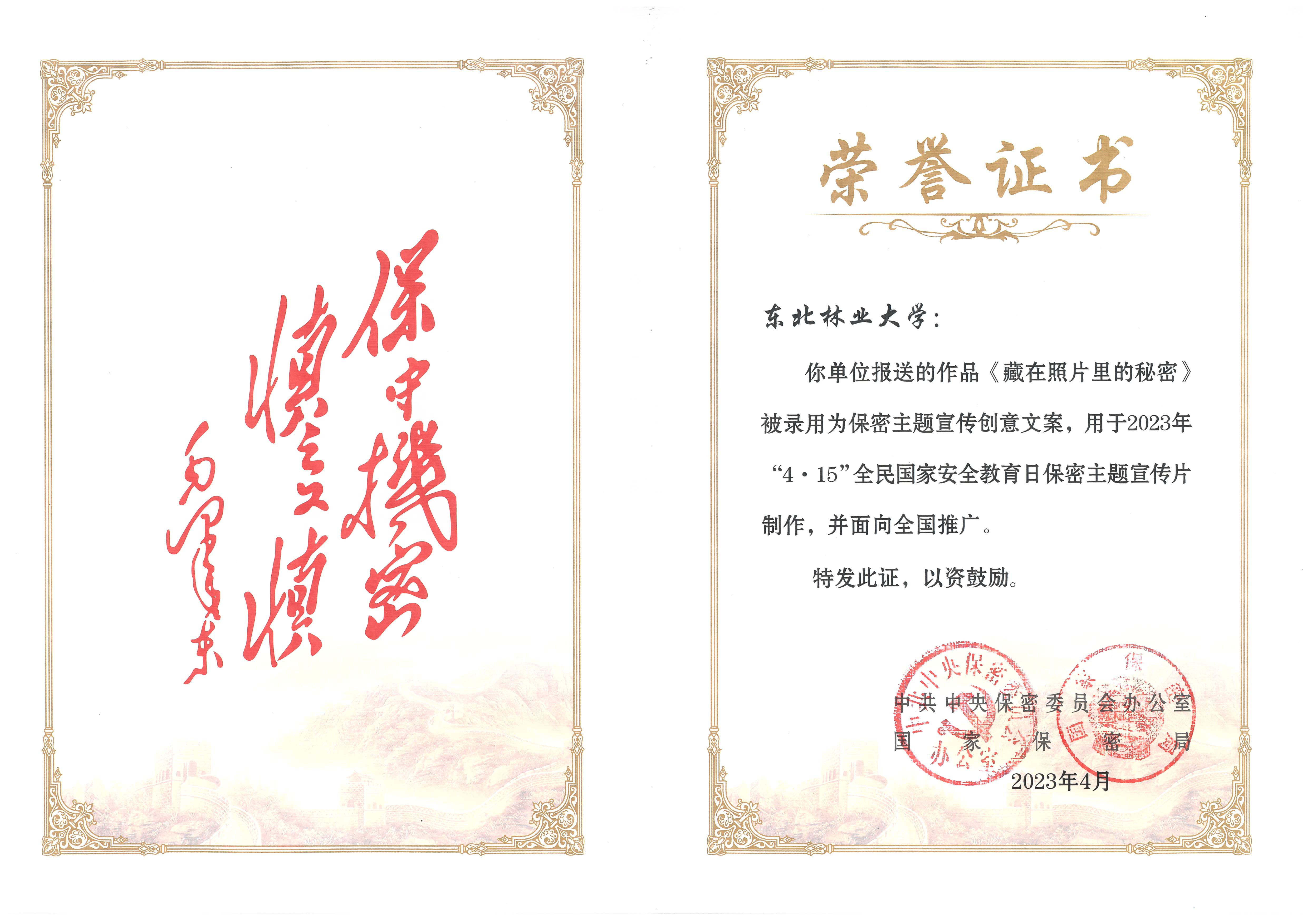 此前,我校文案作品《藏在照片里的秘密》获得全国一等奖,并被中央保密办(国家保密局)录用为保密主题宣传创意文案,用于2023年“4·15”全民国家安全教育日保密主题宣传片制作,并面向全国推广。