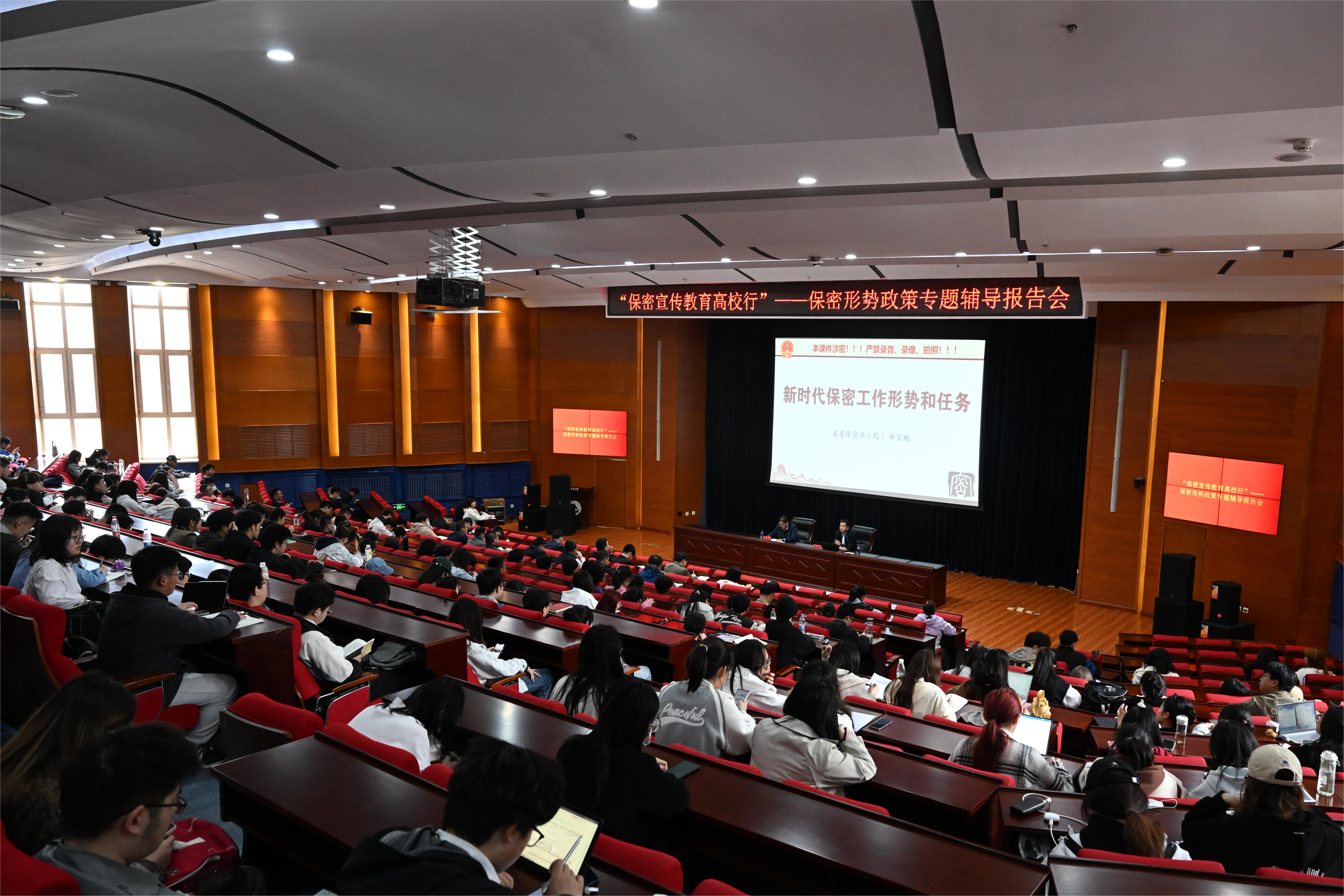 团结奋斗新征程,保守秘密靠大家。为认真学习领会习近平新时代中国特色社会主义思想,深入贯彻落实党的二十大精神,扎实开展好2023年“保密宣传教育高校行”暨保密宣传教育月系列活动,全面加强学校国家安全保密教育,强化做好新时代新征程保密工作的责任义务,在全党上下深入开展学习贯彻习近平新时代中国特色社会主义思想主题教育之际,5月5日下午,学校举行保密形势政策专题辅导报告会。省国家保密局保密科技处专家受邀作了题为《新时代保密工作形势和任务》专题辅导。学校保密委员会成员、全体涉密人员、高层次人才代表、师生代表等400余人参加报告会。学校办公室主任、保密委副主任、保密办主任徐志成主持报告会。