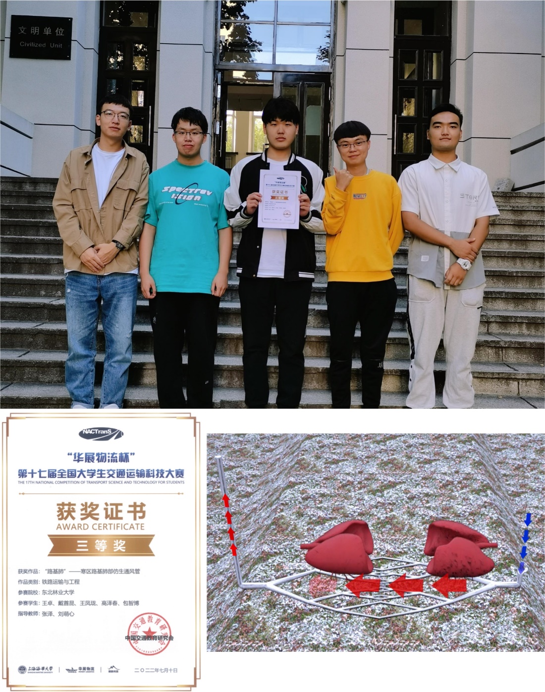 数字未来,智能交通。近日,由中国交通教育研究会、教育部高等学校交通运输类教学指导委员会主办,上海海事大学承办的“华展物流杯”第十七届全国大学生交通运输科技大赛决赛在上海海事大学圆满落下帷幕。我校土木工程学院的参赛作品:“路基肺-寒区路基肺部仿生通风管”荣获三等奖。