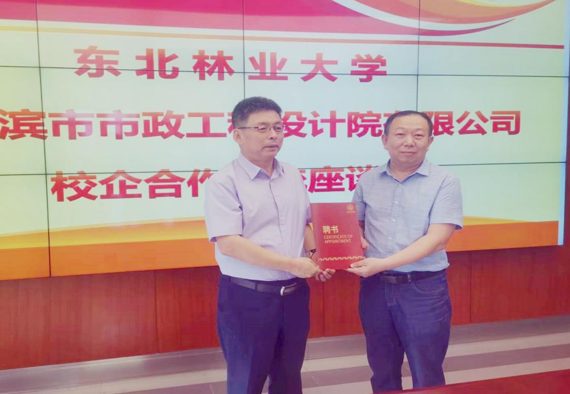 李凤日诚挚邀请哈尔滨市市政工程设计院有限公司相关人员参加东林建校70周年华诞庆祝活动,并向公司副总经理赫英颁发了园林学院规划设计类课程建设校外指导教师聘书。