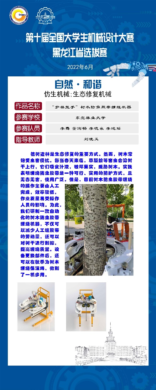 日前,以“自然•和谐”为主题的第十届全国大学生机械创新设计大赛黑龙江赛区决赛落下帷幕。由我校机电工程学院选送的参赛作品《“种草”能手——散放稻草固沙草方格铺设群体协作机器人》《“护林能手”——树木防虫胶带缠绕机器》晋级全国总决赛。