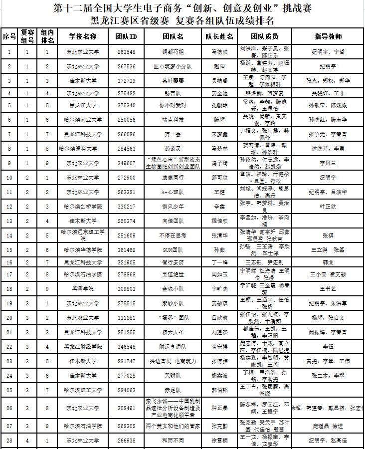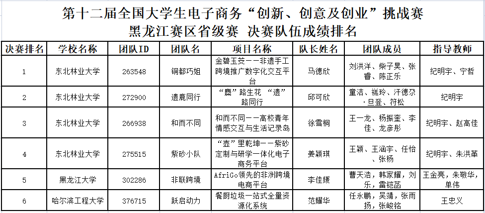 附:第十二届全国大学生电子商务“创新、创意及创业”挑战赛黑龙江赛区省级选拔赛队伍排名
