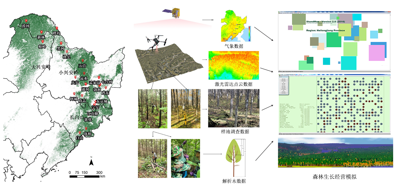 我校森林生长与经营规划团队在负责人李凤日教授的带领下,长期致力于东北林区林分生长模型、森林生物量及碳储量估计、森林可持续经营等理论及技术方面的研究,取得了一系列研究成果,获得了国内外同行的高度认可。十三五期间,该科研团队在长白落叶松生长模拟及多目标经营方面取得了新进展。团队构建了新型的距离有关的单木竞争因子,能够准确模拟树木生长过程,为树木生长模型的构建提供了关键参数;利用分位数模型及混合效应模型等高级统计回归方法,构建了人工长白落叶松枝条数量、大小及生长预测模型,立木树高、枝下高及冠幅预测模型,为长白落叶松人工林多目标经营提供了模型基础;采用包含随机效应的似乎不相关回归及贝叶斯统计方法提升了生物量模型的预测精度及稳定性,为森林碳储量预测及动态模拟提供了技术支撑;利用无人机激光雷达遥感技术,构建了新型长白落叶胸径、枝下高及直径分布等新型遥感预测模型,为森林资源调查提供了新的视角。2021年,相关成果先后在《Remote Sensing of Environment》《IEEE Transactions on Geoscience and Remote Sensing》《ForestEcologyandManagement》《European Journal of Forest Research》《Forest Ecosystems》《Remote Sensing》《New Forests》《应用生态学报》等行业知名期刊发表33篇(其中,SCI论文18篇,Q1区论文13篇,TOP论文9篇)。