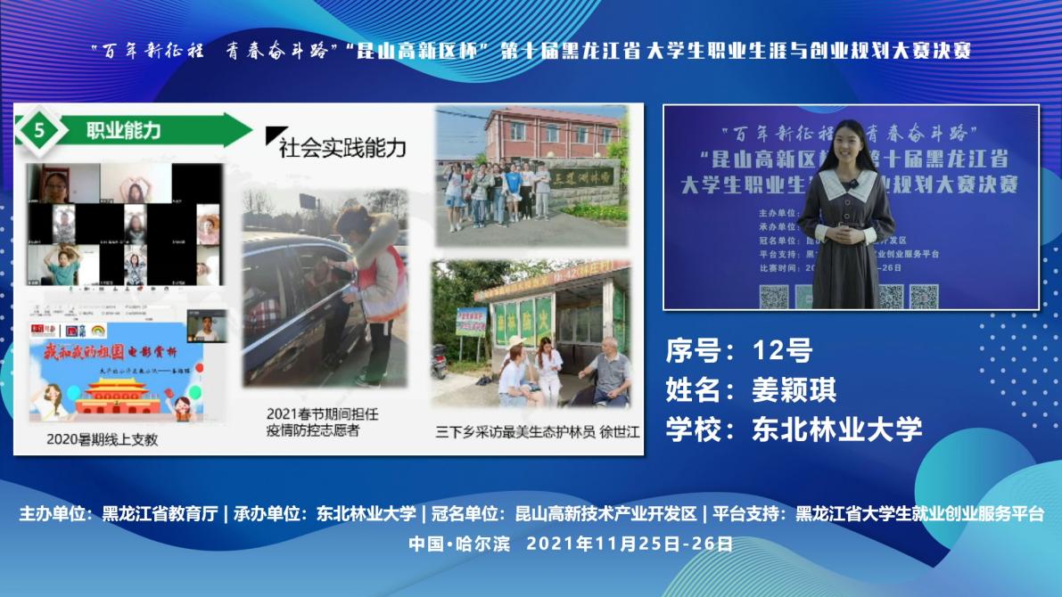 大赛以“百年新征程,青春奋斗路”为主题,选手们在职业方向选择上,更多地将个人价值和未来规划、国家需要、社会发展相结合,展现了龙江学子的青春风采。本次大赛共有43所高校63名选手入围省级决赛,我校经济管理学院姜颖琪夺得本科组一等奖,化学化工与资源利用学院李欣悦、经济管理学院陈巧巧2位同学夺得本科组二等奖,经济管理学院聂英男老师、端木沛衍老师和化学化工与资源利用学院王玺博老师3位老师荣获优秀指导老师奖,我校获大赛优秀组织奖。