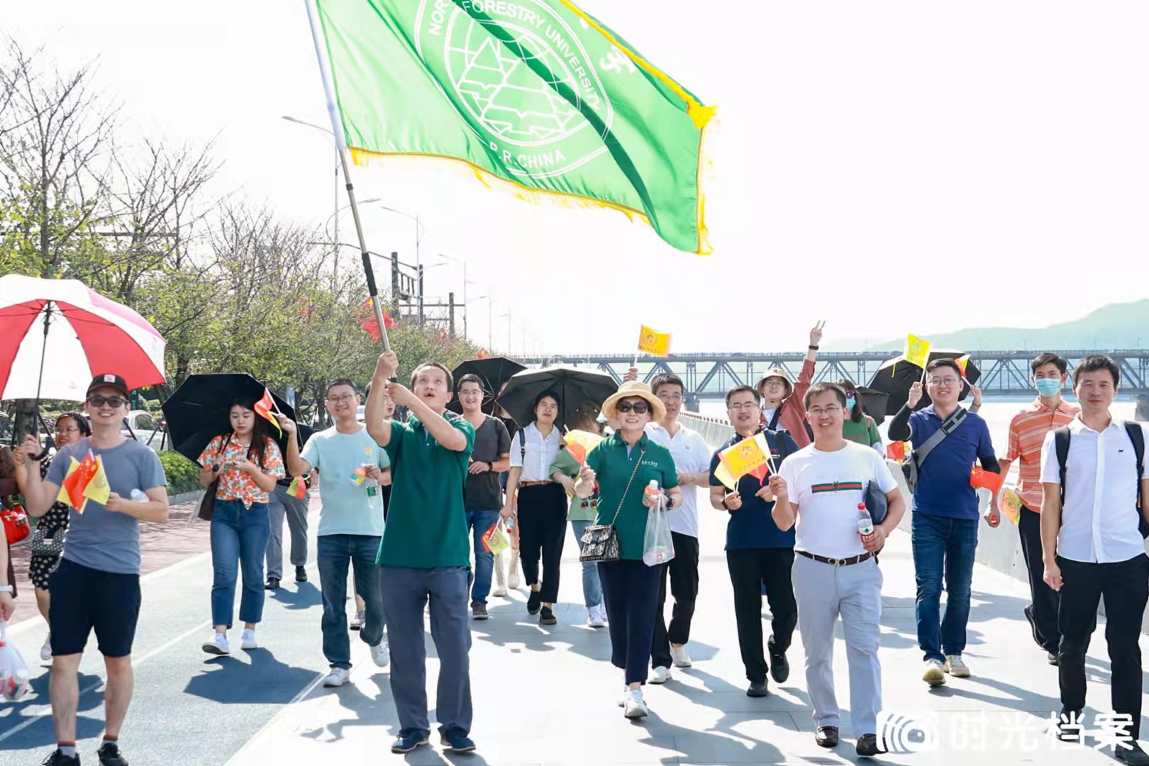 校友们从亚科中心启程,途径西湖风景区、钱塘江大桥、复兴大桥、钱江龙广场、西兴大桥,到达2022杭州亚运会馆(奥体中心),全程7公里。校友们一路欢声笑语,齐唱《前进,东北林业大学》《我和我的祖国》,他们脸上洋溢着喜悦,欢快地舞动着国旗、校旗,激动地大声欢呼着“祖国,我爱您”“东林,我爱您”,他们用炯炯的目光见证现代化城市的发展,用坚实的脚步陪伴着校旗将所在“地标”一一点亮。
