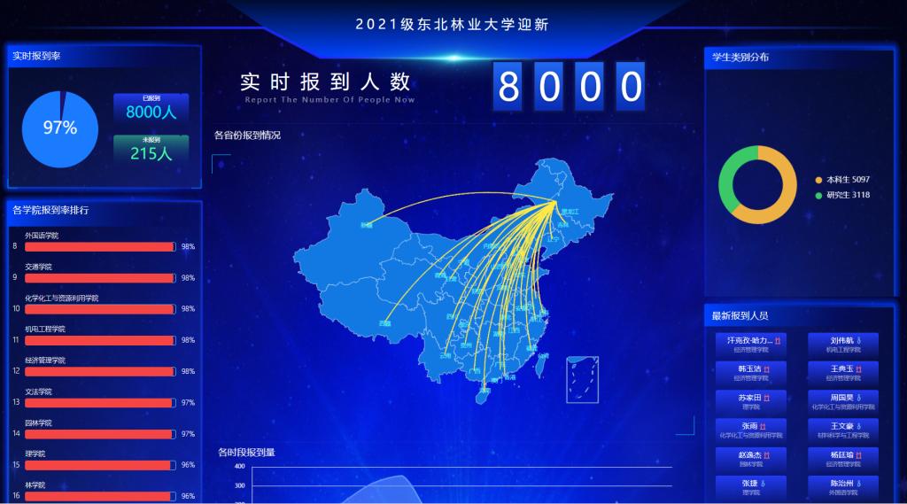 迎新现场,迎新系统实时展示现场报到人数和各学院报到情况统计分布,为现场工作人员及时调整工作方案和工作节奏提供了有力参考。