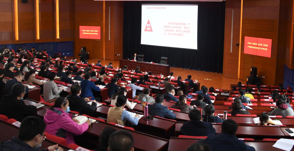 在家的学校领导、意识形态工作领导小组及办公室成员、全体中层干部、二级党委理论学习中心组成员、教工党支部书记参加了在成栋楼4楼举行的辅导培训。党委副书记、纪委书记王玉琦主持报告会。