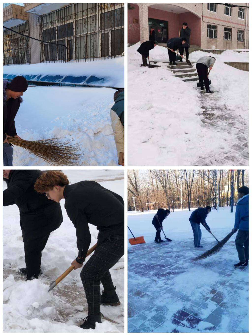 此次降雪十分突然,学校并没有提前划分学院分担区,各个清雪小分队的同学们自觉锁定分担区,纷纷扛起清雪工具,顶着凛冽的寒风,踏着厚重的积雪,穿上棉衣带上手套,分别对丹青楼、成栋楼、逸夫楼等10余处师生主要出行区域展开了一场别开生面、热火朝天的劳动体验。