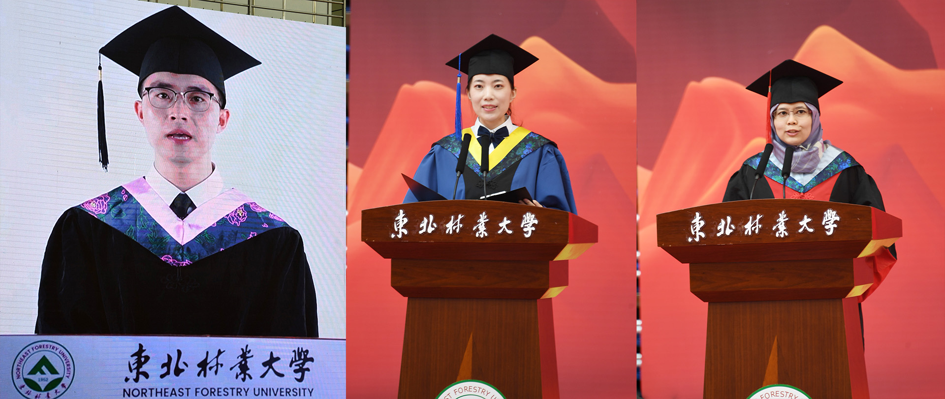 经济管理学院张诗浩的母亲贾红超,财会专业93届毕业生、中国民生银行北京首体支行行长唐铁宝,毕业本科生代表、外国语学院周桐,毕业研究生代表、化学化工与资源利用学院王莹,毕业留学生代表、来自印度尼西亚的庄天宁先后发言,他们表达了对东林的感谢,并祝愿所有毕业学生能够牢记母校“学参天地、德合自然”的校训,为祖国建设贡献力量。