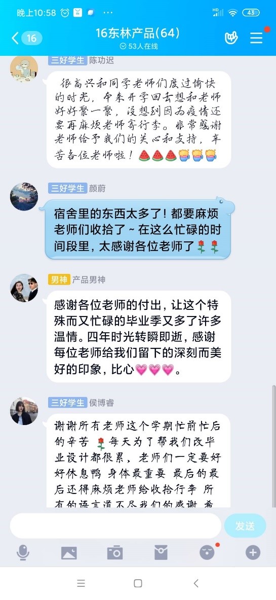 林学院森林保护学科硕士毕业生王振越说:当“毕业季”变成了“毕业寄”,沉寂多日的宿舍又充满了师生视频核对物品的交谈声、物品托运的摩擦声、匆忙上下楼的脚步声。作为一名毕业生,也作为亲历其中并且即将走上辅导员岗位的东林人,我竟觉得这些声音如此的悦耳动听,那样的温暖感动。也许我们的毕业季有遗憾,但是我们的最好的年华在东林度过很值得!