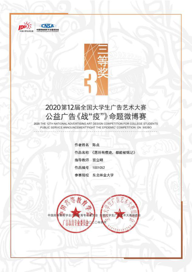 在第12届全国大学生广告艺术大赛“战‘疫’”命题赛事中,由广告学专业17级陈点同学创作的作品《愿每一个痕迹,都会被铭记》荣获三等奖。此外,疫情期间,由中国广告协会主办的大学生专项“学院奖”公布了2019年秋季赛获奖名单,广告学专业获奖数量达105项,其中金奖1项、银奖1项、铜奖2项。