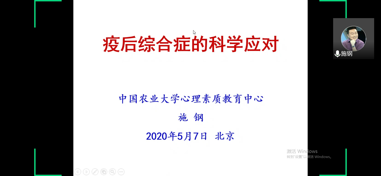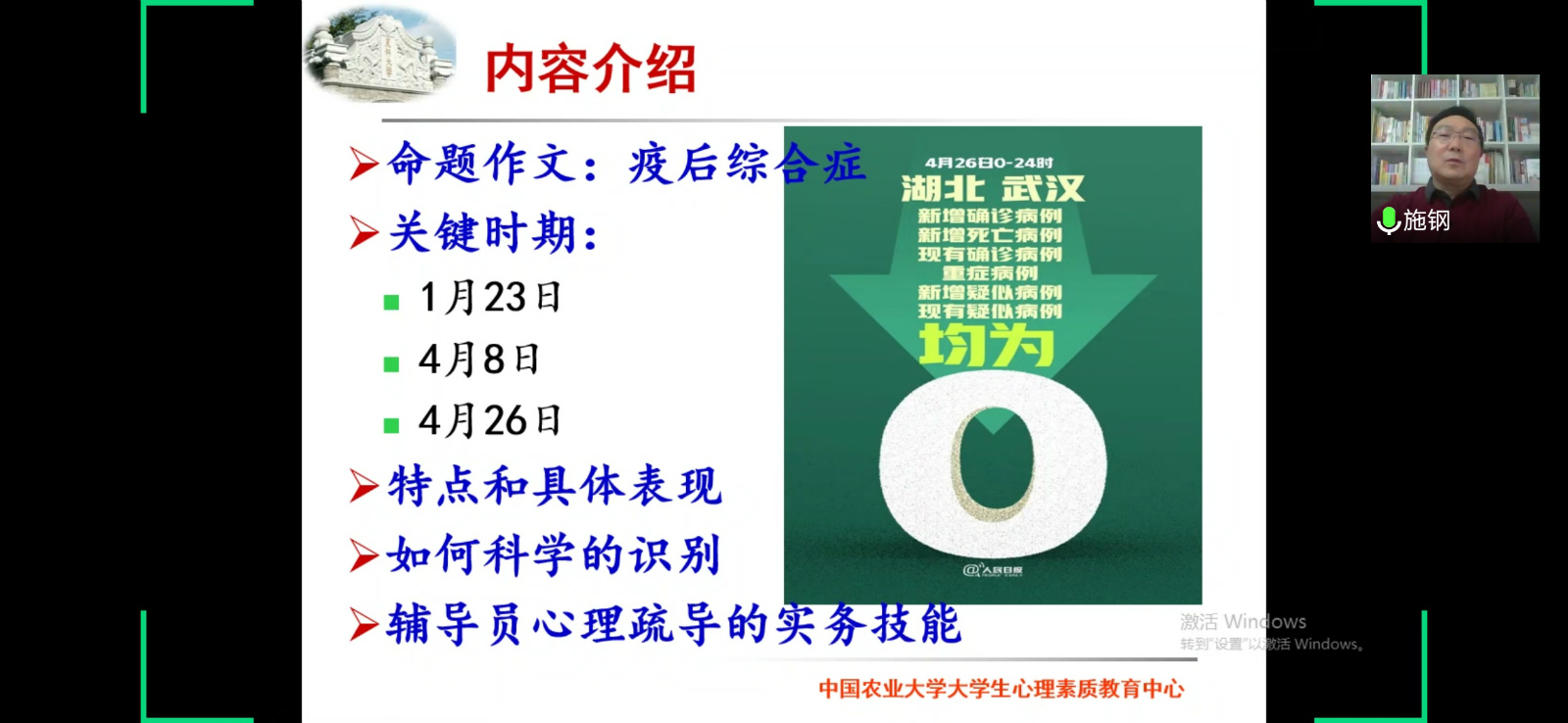 施钢老师从“疫后综合症”的特点和具体表现、如何科学的识别入手,清晰地勾勒出“疫后综合症”的基本内涵、概念和可能衍生的心理问题。他结合本次新冠肺炎疫情的特殊性和中国农业大学的工作经验,与全体政工干部分享了相关的心理疏导实务,尤其是“了解、接纳、表达、沟通、行动”五步法,让与会的政工干部上了一堂干货满满的心理健康工作实务培训课。培训的最后,施钢老师还与个别辅导员就具体案例开展了线上交流。