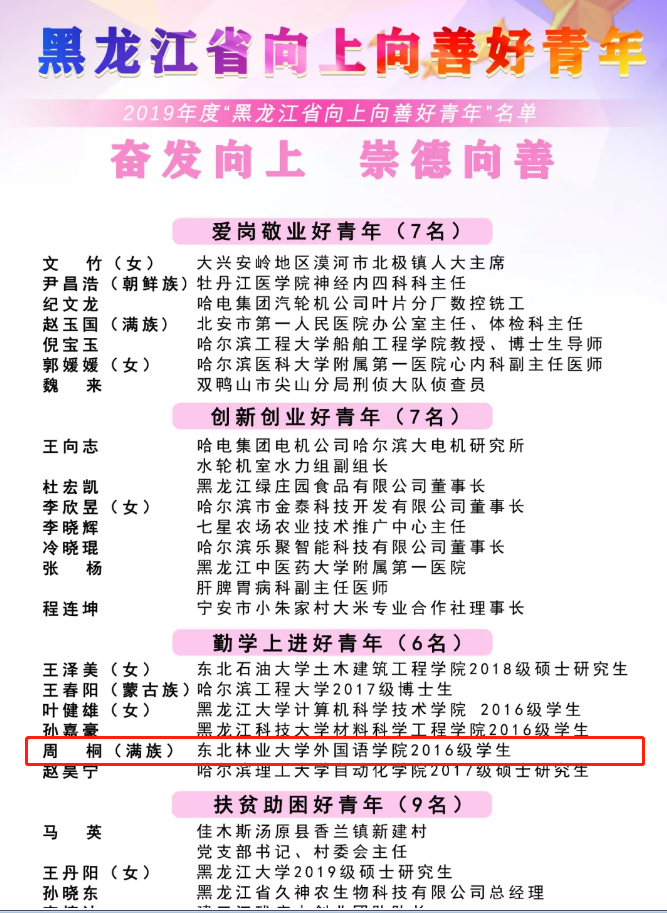 据悉,为表彰全省优秀青年在国家经济社会发展中的杰出贡献,集中展示新时代龙江青年的精神品格和价值追求,激励和引导全省广大青年继承发扬五四精神,团省委、省青联经过评选,决定授予43名同志第22届“黑龙江省青年五四奖章”,授予25个青年集体“黑龙江省青年五四奖章集体”,追授2名同志“黑龙江省青年五四奖章”。同时,为充分发挥青年典型的示范引领作用,推选一批新时代模范践行社会主义核心价值观的向上向善好青年,团省委经过评选,决定授予40名涵盖医务工作者、科技工作者、创业者、教师、产业工人、公安干警、志愿者、大中学生等职业和领域,以及在新冠肺炎疫情防控工作中涌现出的优秀青年典型2019年度“黑龙江省向上向善好青年”荣誉称号。