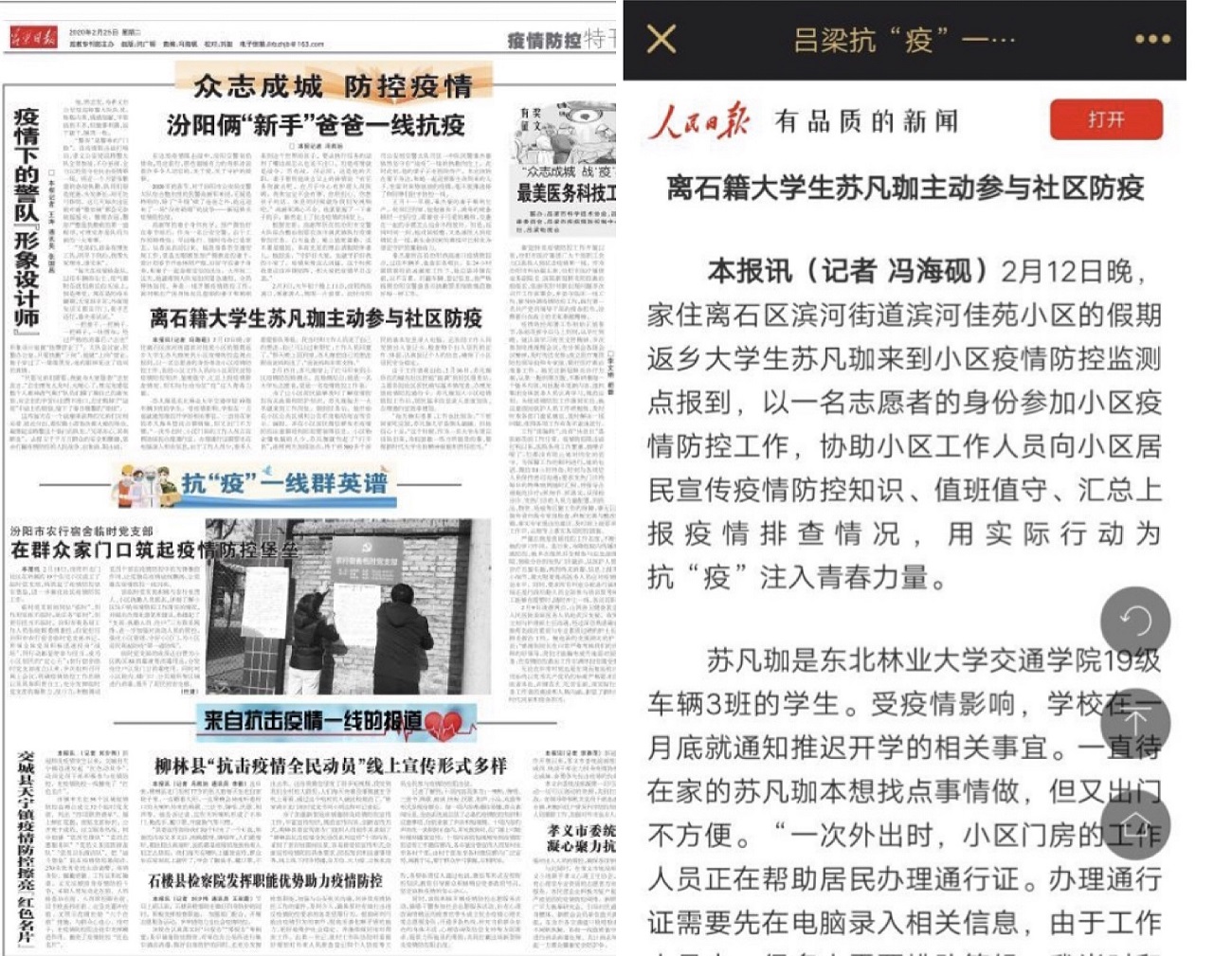 交通学院 2019 级车辆 3 班苏凡珈同学参与家乡社区防疫工作事迹被吕梁日报报道