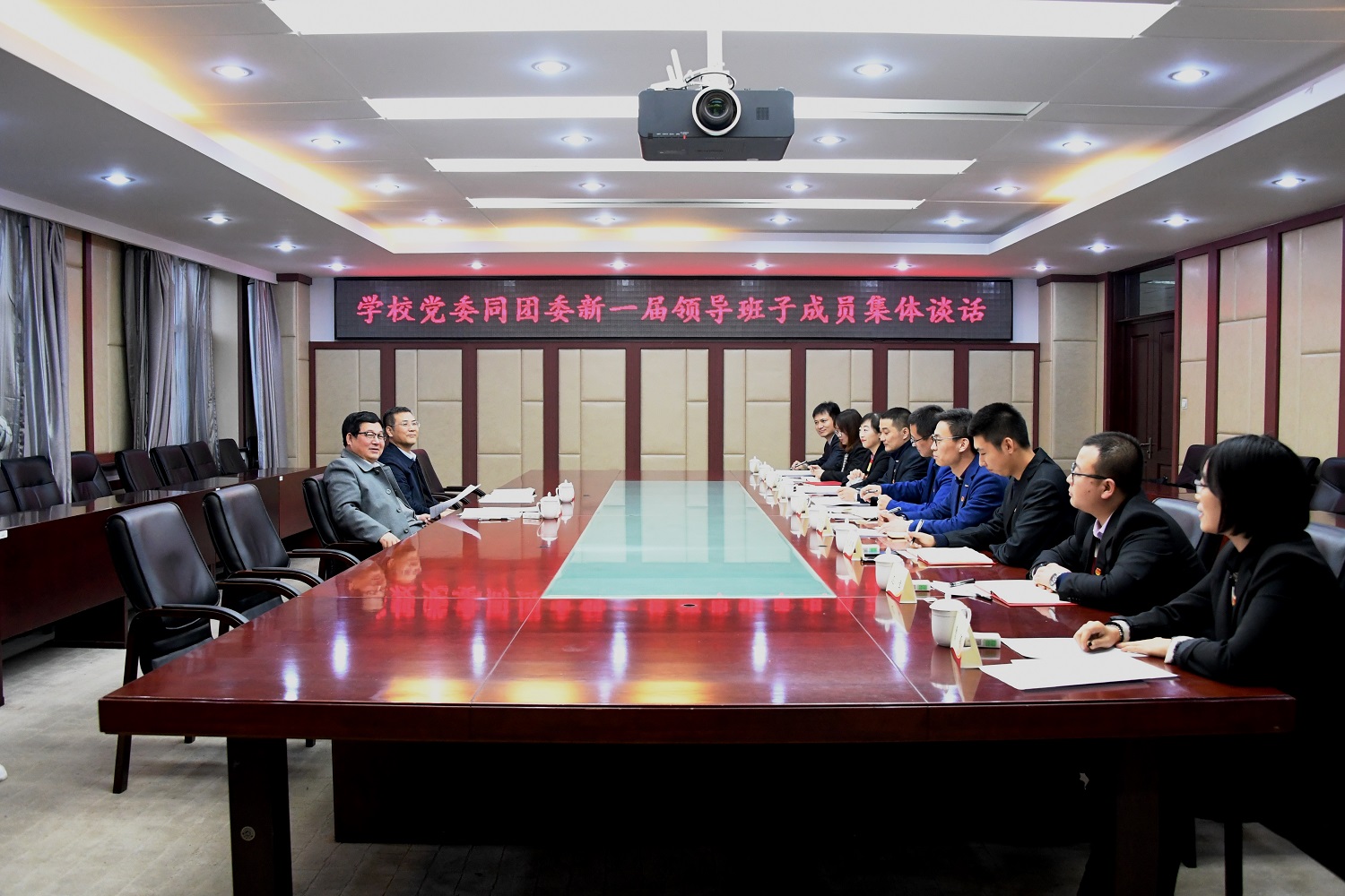 12月10日下午,学校党委书记张志坤同团委新一届领导班子成员集体谈话,学校党委常委、副校长雒文虎主持会议。