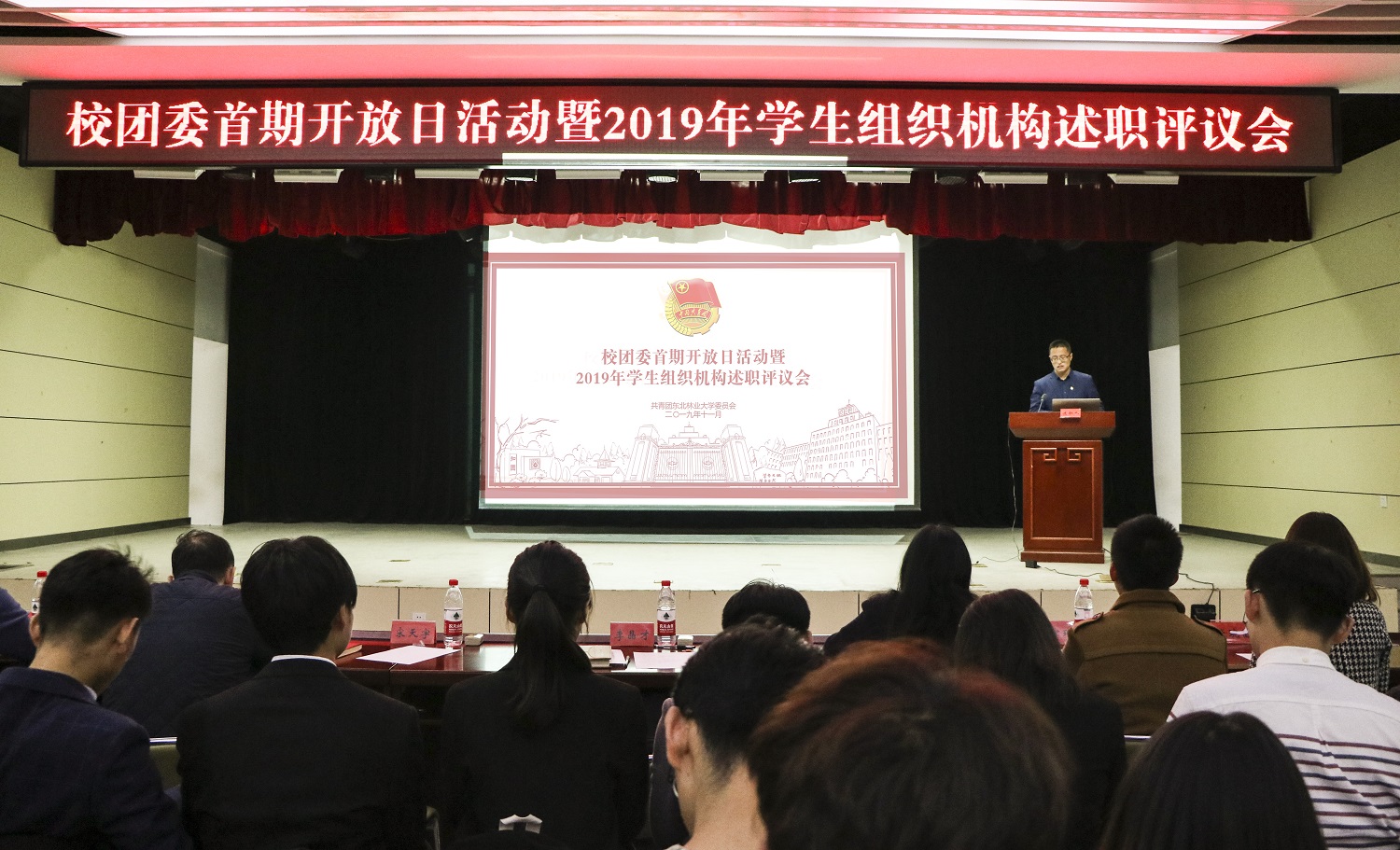11月13日下午,校团委首期开放日活动暨2019年学生组织机构述职评议会在颐丰园学生活动中心报告厅举行。校团委全体专兼职团干部、各学生组织机构负责人、各学院团员和团干部代表等300余人共同参与活动。