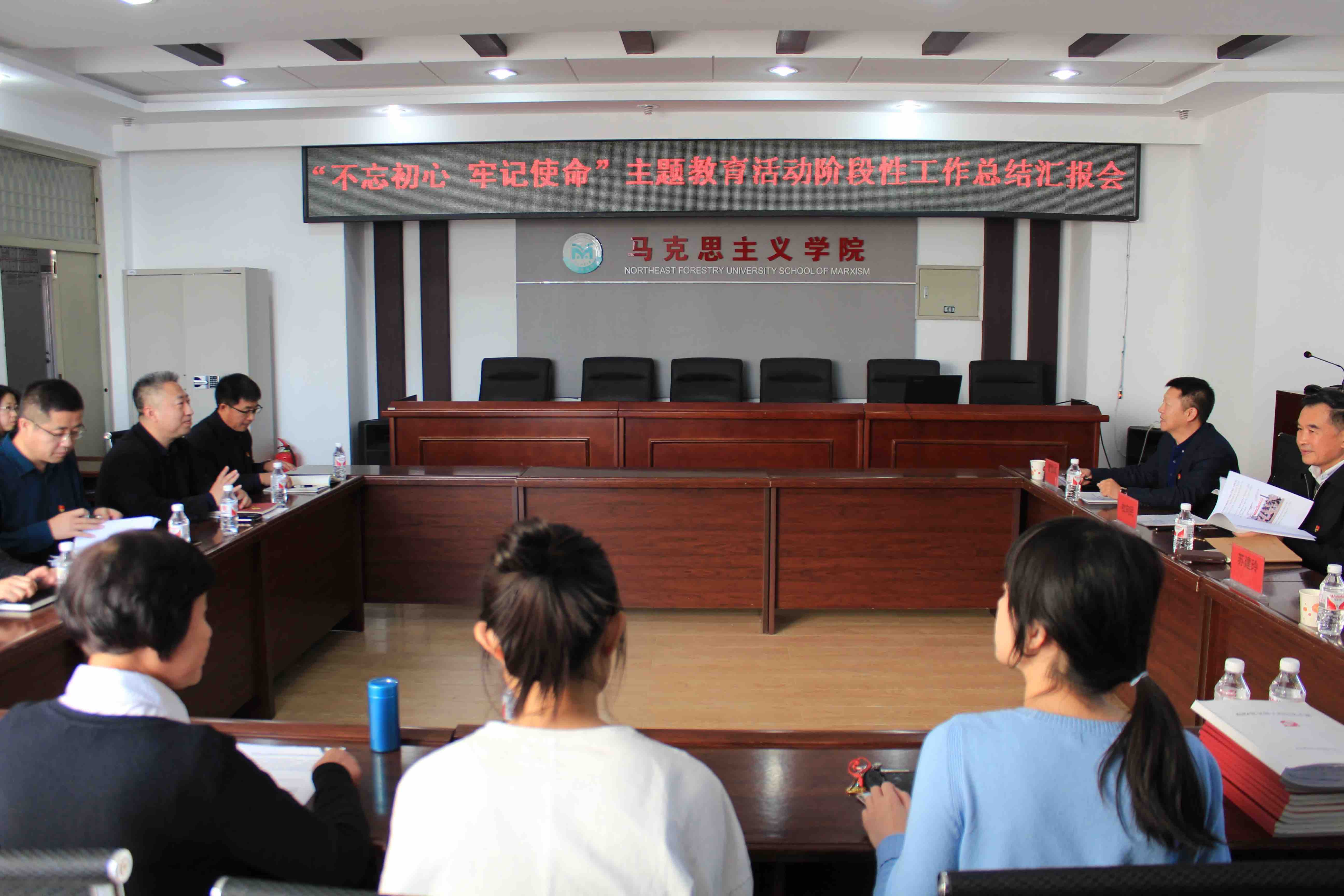 首先马克思主义学院两位思政课教师汪金英、王兰进行了现场教学展示。接着侯彦杰院长从学院的基本情况、工作成绩、存在的不足、采取的措施等方面汇报了马院建设发展的基本情况。学院党总支书记刘经纬从集中学习研讨情况、主题教育活动开展情况、调查研究情况、检视问题情况、整改落实情况五个方面汇报了主题教育阶段性工作情况。最后马克思主义发展史、基本原理学科教工党支部和马克思主义中国化学科教工党支部分别汇报了本支部的“不忘初心,牢记使命”主题教育活动开展情况。