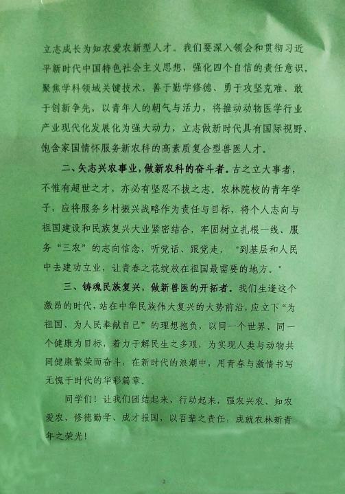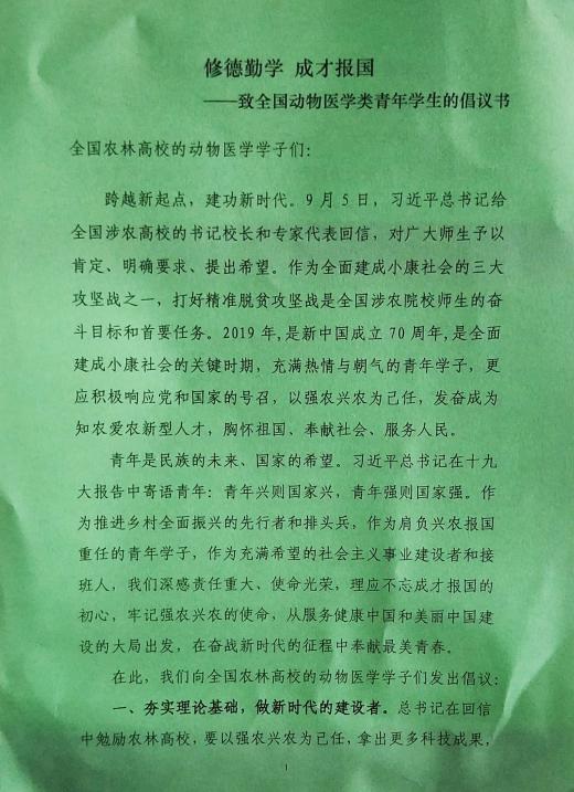 “修德勤学,成才报国”——致全国动物医学类青年学生的倡议书
