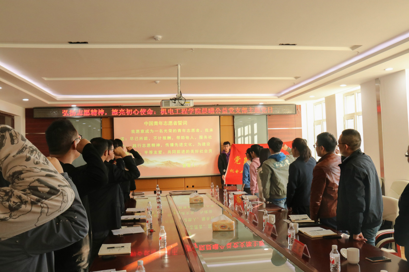 支部书记杨林光带领大家郑重地重温了“中国青年志愿者誓词”。大家一致同意,以此次主题党日为契机,向全校各基层党支部发出倡议:在党建引领下的志愿服务中,擦亮初心使命、磨砺初心使命、践行初心使命。