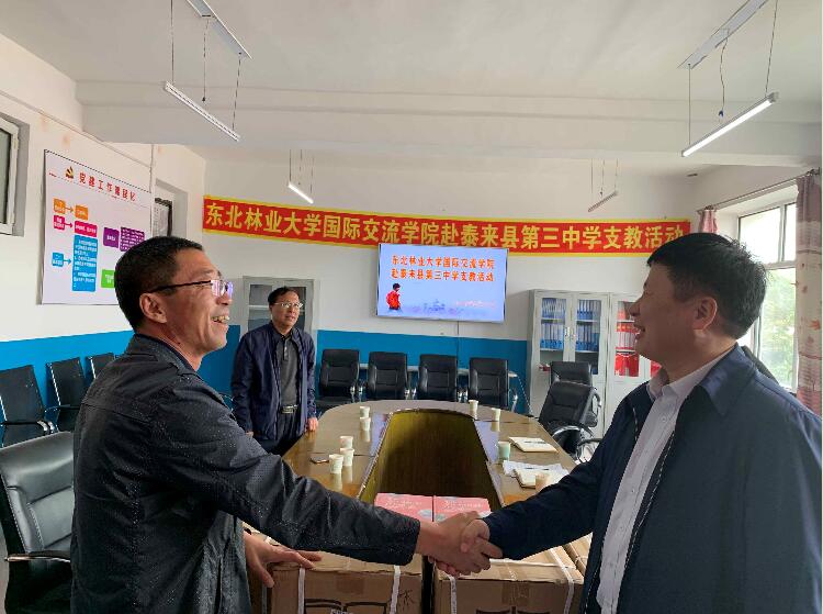 11时,支教队成员与泰来县第三中学校长丁伟及教师代表进行了座谈。丁校长介绍了该校基本情况,并表示近年来学校外教缺失,希望能够通过与东林国际交流学院合作,为三中师生提供国际文化交流的平台。我校国际交流学院副院长岳喜华简要介绍了支教活动的筹备工作和两名留学生的基本情况,表示此次支教活动是助力地方教育发展,开阔泰来县中学生国际视野,提高英语交流能力的积极尝试。双方还就未来中外学生交流形式进行了深入探讨。丁校长代表该校接受了国际交流学院捐赠的50本最新版牛津高阶英汉双解词典。