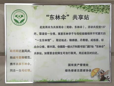 东林共享雨伞(东林伞)投放活动在全校展开。于锦绣楼、丹青楼、成栋楼、综合办公楼、颐丰园、俭德园一楼大厅和图书馆门廊处7处“东林伞”共享站,共投放137把共享雨伞,取谐音一生情,寓意东林学子与母校结缘相伴不可磨灭的“一生东林情”。伞面上印有“我属于东林”logo,整体形象与我校校徽基调一致,整体为绿色,呈三角形,东林二字在logo中呈现出一棵大树的形状,预示着东林永远都会为东林学子遮风挡雨;下方我属于东林的中英文,体现了东林学子情系东林的内心归属感。东林共享雨伞的投放响应了国家节能宣传周宗旨,在雨天为同学们遮风挡雨、提供便利,让全校师生感受不一样的生活体验,向大家倡导资源共享节能环保理念的创新举措,在履行党中央、习主席面向未来、敬畏自然、珍爱地球、树立绿色、低碳、可持续发展理念的道路上,展现东林风采的具体实践。