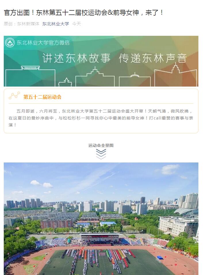 更多内容,点击下图收看东北林业大学官方微信《官方出图!东林第五十二届校运动会&前导女神,来了!》
