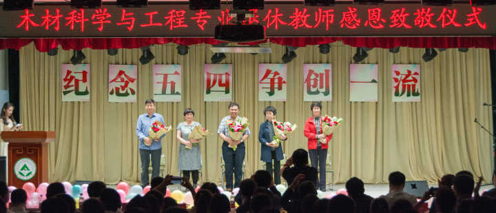 尊师重道,饮水思源。在向退休教师致敬环节,学生代表向退休教师李晓平老师、翁向丽老师、张一帆老师、刘一星老师、崔永志老师敬礼献花。正是他们的无私奉献,为学校一流学科建设贡献出巨大力量,成就了桃李满天下的芬芳,也铺就了木材科学与工程专业的前进的道路!