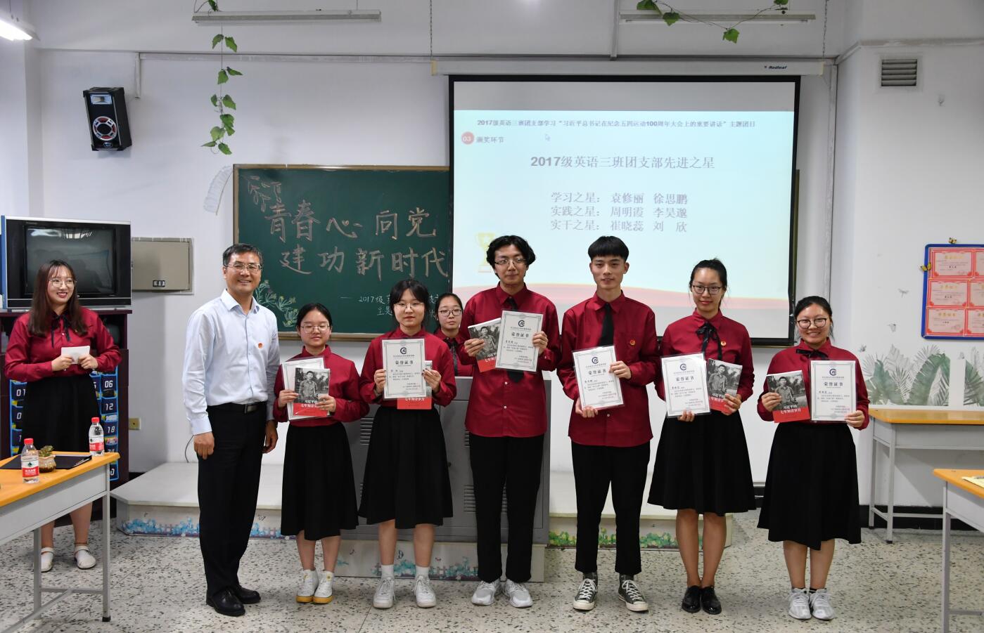 最后,英语专业2017级3班团支部发起了学习习近平总书记在纪念五四运动100周年大会上的重要讲话精神的倡议,希望全校各级团支部、全体团员青年,学原文、悟原理,在真学真信真用中坚定理想信念;勤修身、强素质,在练就过硬本领中担当时代重任;惜韶华、建新功,在奋斗和奉献中实现人生价值。