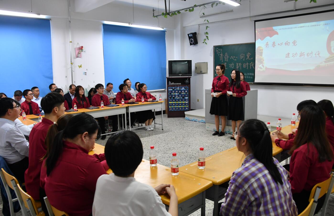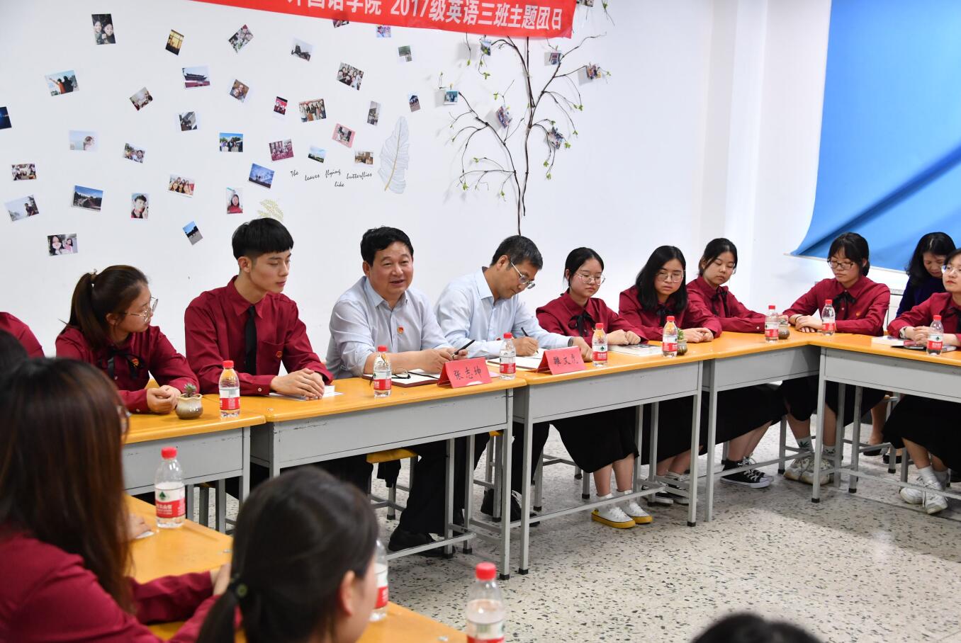 5月16日14时,在文博楼808教室,外国语学院英语专业2017级3班团支部举行了学习习近平总书记在纪念五四运动100周年大会上的重要讲话精神主题团日活动,学校党委书记张志坤、副校长雒文虎深入班级团支部,并与团员亲切交流。