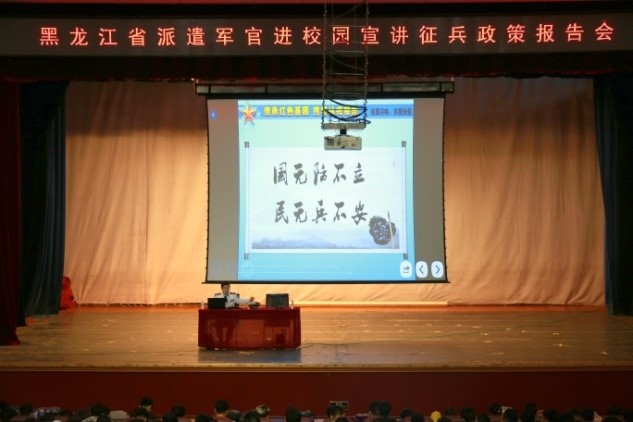 报告会后,召开了东北林业大学2019征兵动员大会,党委武装部副部长陈国华结合近年来我校征兵工作方面取得的成就,以及涌现出的优秀大学生士兵事迹,向同学们清晰传递了大学生参军入伍不仅是建设巩固国防和强大军队的迫切需要,也是服务经济社会发展和维护国家长治久安的客观要求,是一项利国利军利民的大事好事。最后,陈国华副部长向同学们发出三点倡议:树立国防观念,坚定报国之志;正确认识参军,合理规划人生;广泛宣传动员,营造浓厚氛围。