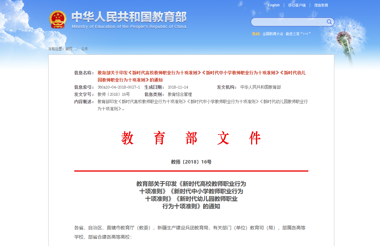 近日,教育部印发《新时代高校教师职业行为十项准则》(教师〔2018〕16号,以下简称“准则”),明确新时代教师职业规范,划定基本底线,深化师德师风建设。