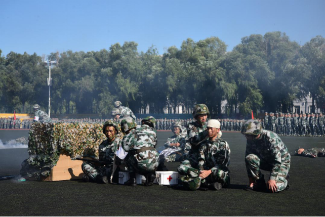 大会在雄壮的国歌声中拉开帷幕。首先进行的是三个科目的军训成果展示。由生命科学学院组成的战场医疗救护表演队伍首先登场,救护技术包括止血、包扎、固定、搬运等,展演同学动作标准、熟练,专业性极强,营造了形象生动的战场氛围;随后,由机电工程学院组成的军体拳表演队伍跑步入场,同学们身形矫健、拳脚敏捷、动作整齐、沉着有力,呈现了铁血男儿的阳刚之美;最后一个科目是由外国语学院女子方阵带来的捕俘刀表演展示,全体女兵英姿飒爽、口号嘹亮、姿势精准、动作到位,展现了女同学巾帼不让须眉的气势和风貌!