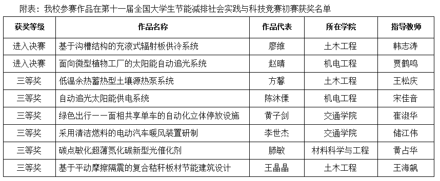 7月5日,第十一届全国大学生节能减排社会实践与科技竞赛(简称节能减排国赛)初赛成绩揭晓。经过竞赛专家组会议评审,我校共有8项作品获奖,其中2项作品进入决赛,6项作品获得三等奖,创造我校参加此项赛事的历史最佳成绩。