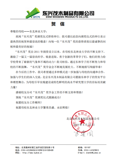 作为奖学金的捐资企业,东兴茂木制品有限公司专门发来贺信,公司董事长、我校机电工程学院1986级校友宋建国代表公司对所有获奖的同学表示衷心的祝贺,对他们的努力给予了充分的赞誉,并希望今后可以通过多种形式进一步加强东兴茂木制品有限公司和母校的交流和联系,加强与学生们的亲切交流。