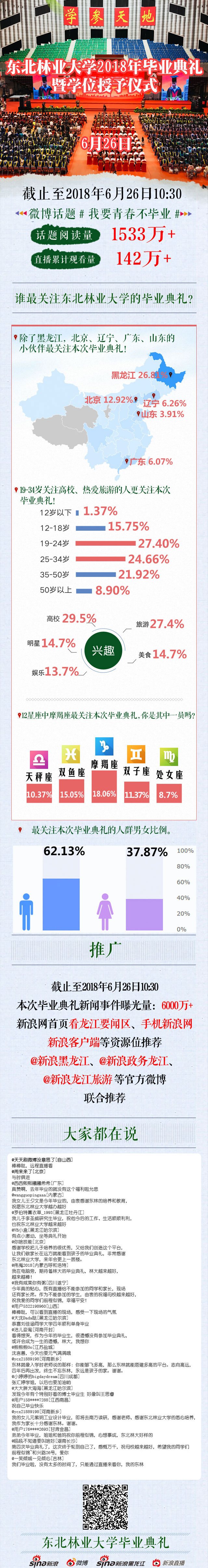 来自全国各地的142万+网友在线收看了这一盛况,除黑龙江省有26.81%网友关注外,北京、广东、辽宁、山东等省市网友也对本次典礼予以关注。