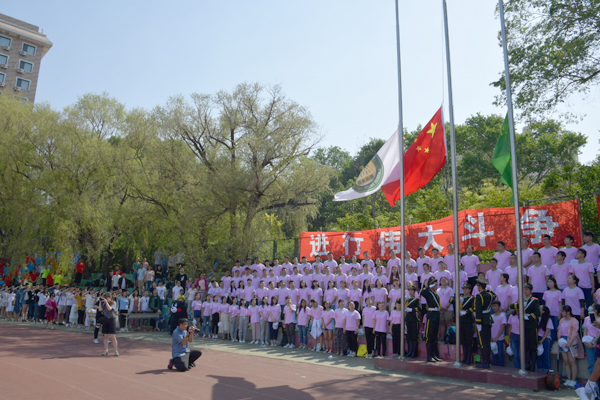 在雄壮的国歌声中,国旗、校旗和运动会会旗冉冉升起。