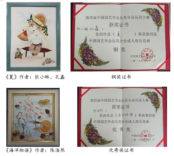 由中国园艺学会压花分会主办,河南农业大学承办的“第四届中国园艺学会压花分会压花大赛”于2018年5月13日在郑州河南农业大学标本馆圆满结束。本次全国压花艺术大赛成人组入选作品高达157件,创历届比赛参赛作品数量之最。我校园林学院学生狄小琳、孔鑫同学创作的水果压花画作品《夏》以其巧妙的选材,生动的画面,可爱的童趣赢得了评委们的推崇而荣获铜奖。陈浩然同学创作的水果压花画作品《海洋物语》也以其独特的构思,清新的画风收获了优秀奖。