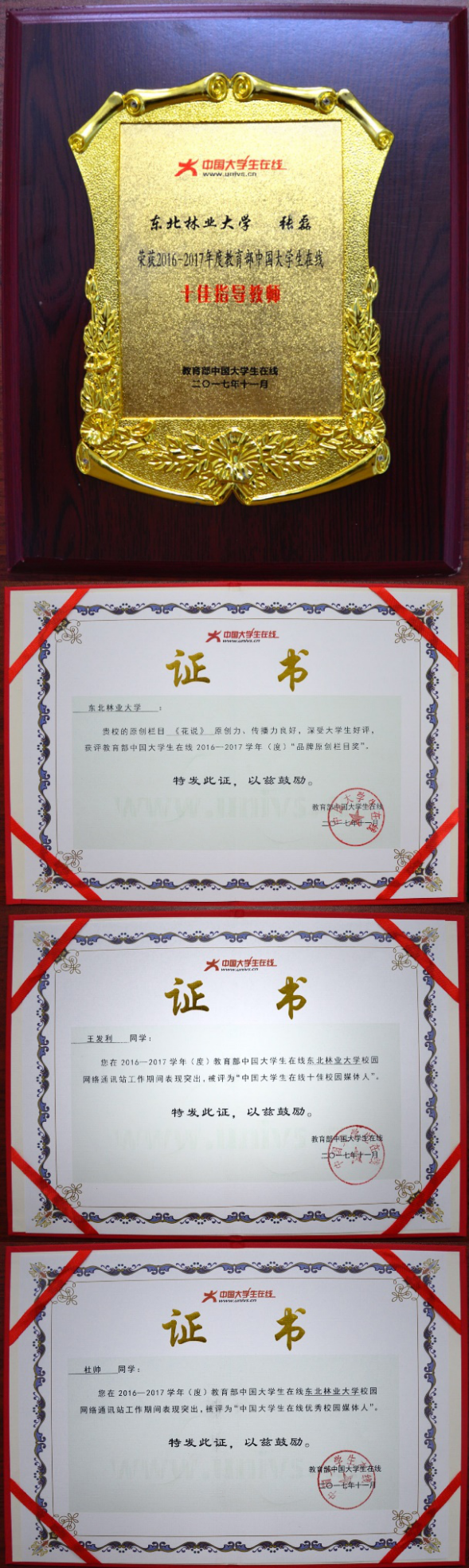近日,2016-2017年度教育部中国大学生在线年度评选结果揭晓,我校校园网络通讯站从全国540家建站高校中脱颖而出,以全国高校综合成绩排名第六、省内高校独占鳌头的优异成绩被评为年度全国“十佳校园网络通讯站”,与此同时,原创栏目“花说”获评年度“品牌原创栏目奖”,原创专栏“浮光绿影”获评年度“中国大学生在线人气专栏”称号,张磊老师获评年度全国“十佳指导教师”称号,王发利同学获评年度“十佳通讯员”,杜帅同学获评年度“优秀通讯员”称号(全国90名)。
