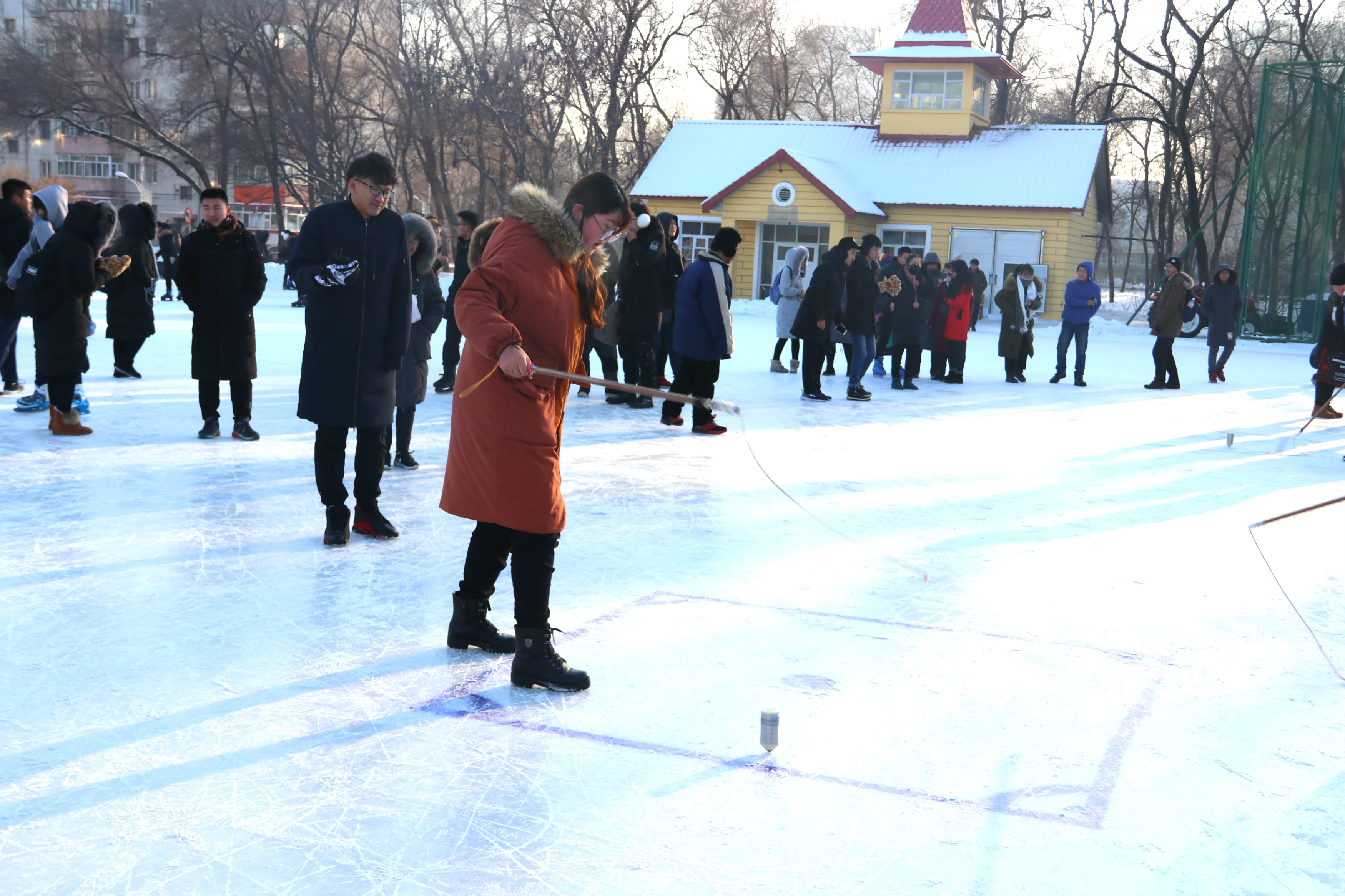 冰尜又称冰猴或冰陀螺,常规为4-6厘米高,材质有木、铁、铝、不锈钢等多种。比赛要求在4米见方的冰面上设置起点,在此点外围四个方向设计分点,选手在起点将冰尜转起,在限定时间内持鞭将冰尜从起点抽向外围各计分点,顺次经过外围各圆点。比赛中,同学们都异常谨慎,生怕陀螺停转,最终交通学院的沙克热孜提、生命科学学院的高馨竹凭借娴熟的技巧,分获男子组、女子组冠军。赛后,来自新疆的沙克热孜提表示,在冰天雪地里参加冰上活动是十分特殊的经历,我们不仅可以锻炼身体,还能体验到别具特色、富有新意的地域文化。