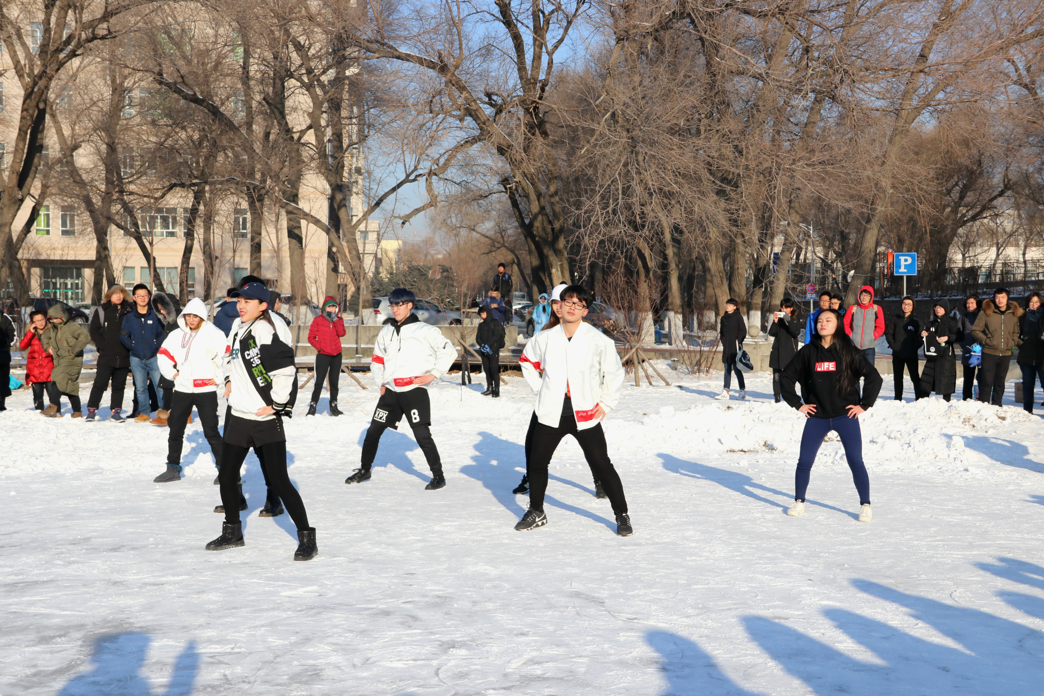 为营造浓厚热烈的冰上运动氛围,学校街舞队在冰场带来了别开生面的街舞快闪表演。13时,15位街舞队的同学汇聚到场地一侧,伴着动感的音乐开始了他们的精彩舞蹈表演。《samsara》《boom》两段街舞很快引发大量从冰场经过的师生们驻足观看,也让更多的同学加入到“冰上趣味运动会”中。