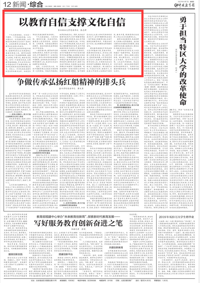 12月7日,《中国教育报》在12版头条位置以《以教育自信支撑文化自信》为题,刊发了我校党委书记张志坤的署名文章。