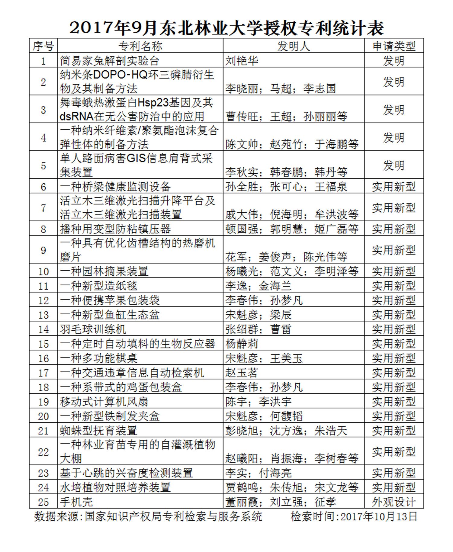 根据国家知识产权局专利检索与服务系统(www.pss_system.gov.cn)的统计数据,2017年9月,我校师生获得专利授权25项,其中发明授权5项,实用新型授权19项,外观设计授权1项。