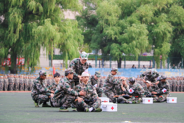 大会在雄壮的国歌声中拉开帷幕。首先通过主席台的是由机电工程学院2017级学生组成的百人方队,同学们精神饱满、队列整齐、步伐铿锵、口号响亮,展示了本次学生军训成果,本月28日,这支百人方阵还将代表我校参加全省军训成果汇报会;500人的军体拳表演随后登场,同学们身形矫健、拳脚敏捷、动作整齐、沉着有力,充分体现了东林学子的风采和朝气;战场医疗救护由工程技术学院进行展演,救护技术包括止血、包扎、固定、搬运等,展演同学动作标准、熟练,专业性极强,赢得了现场师生的阵阵掌声。